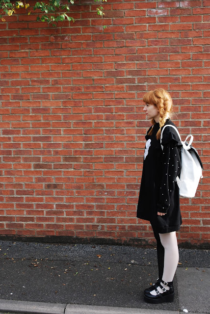 Ahhh I just got this jumper and was literally just thinking of styling it up with black and white tights too (with much less cooler shoes I must admit), do great minds think alike or what? Hehe you look amazing as ever, love your hair! I'm not dressing up as anything particular for halloween but spooky touches all month round are perfect <3